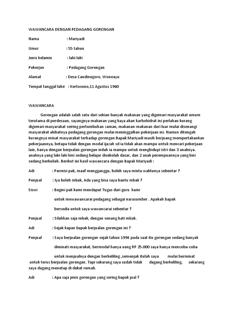 Kewirausahaan Wawancara from imgv2-2-f.scribdassets.com Check spelling or type a new query. Maybe you would like to learn more about one of these? We did not find results for: Contoh hasil wawancara dengan pedagang.