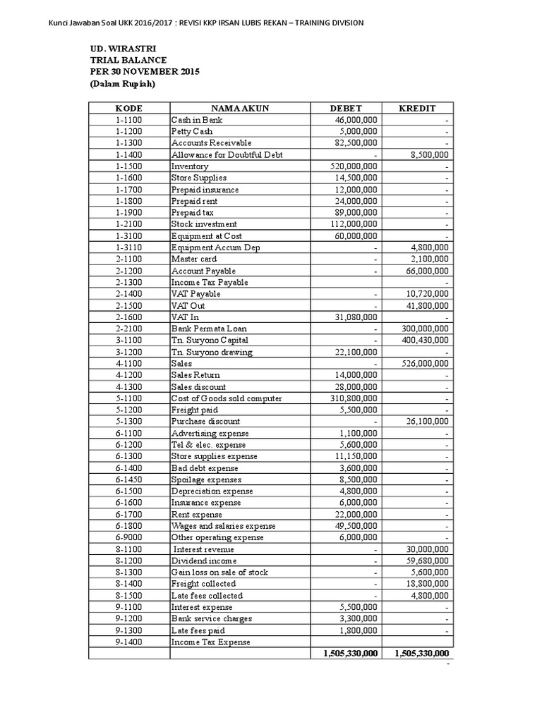 Contoh soal myob v18 brosur perusahaan akuntansi. Kumpulan contoh soal rekonsiliasi bank beserta jawabannya. Buana trial balance, per 1 desember 2018. Sebagai distributor tunggal, perusahaan tersebut membeli barang dagangannya secara kredit dari beberapa importir di. Sekolah menengah kejuruan (smk) pada tahun 2020 mendatang akan segera mengadakan ujian praktik kejuruan (upk) atau uji kompetensi keahlian (ukk). Kunci jawaban ukk akuntansi 2018. Untuk mendownload ukk tahun 2018 pt kurnia silahkan klik disini. Soal praktik akuntansi ud buana contoh kalimat pemberitahuan anak sd. Pembahasan lengkap soal simak ui 2018 biologi kode soal 412 reaven 700 am. Saldo allowance (k) = 18.800.000. Cara mengerjakan myob ud buana guru ilmu sosial. Pembahasan dan kunci jawaban soal praktek ukk smk jurusan akuntansi tahun pelajaran 20182019. Ud buana ujian ukk akuntansi 2019 soal ukk akuntansi 2017 ud wirastri wawancara ukk akuntansi soal ukk akuntansi paket 1 ukk akuntansi 2019 pt sejahtera ukk akuntansi 2017 ukk 2016 akuntansi ud buana.