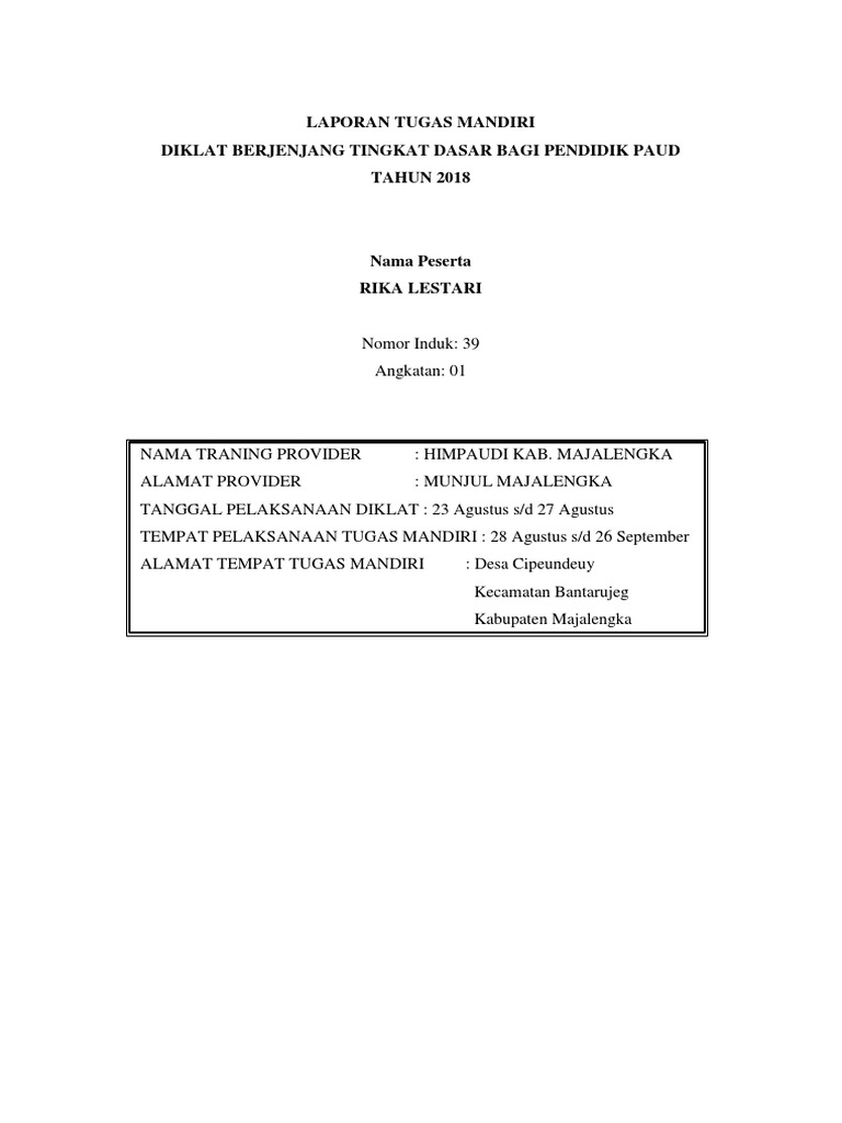 Contoh Laporan Tugas Mandiri Diklat Lanjut Paud 2018 ... from imgv2-1-f.scribdassets.com Laporan tugas mandiri diklat berjenjang tingkat lanjut bagi pendidik paud tahun hormaida tampubolon pdf free download. Pp paudni reg ii semarang alamat provider : Laporan akhir tugas mandiri diklat berjenjang paud tk tingkat dasar 2014 1. Contoh tugas mandiri kelas berjenjang 2. Jldiponegoro ungaran tanggal pelaksanaan diklat. Jl.diponegoro ungaran tanggal pelaksanaan diklat : Doc contoh karya ilmiah permainan membaca dan menulis di. Desa datar rt 02 rw 03 kecamatan sumbang kabupaten banyumas no hp :