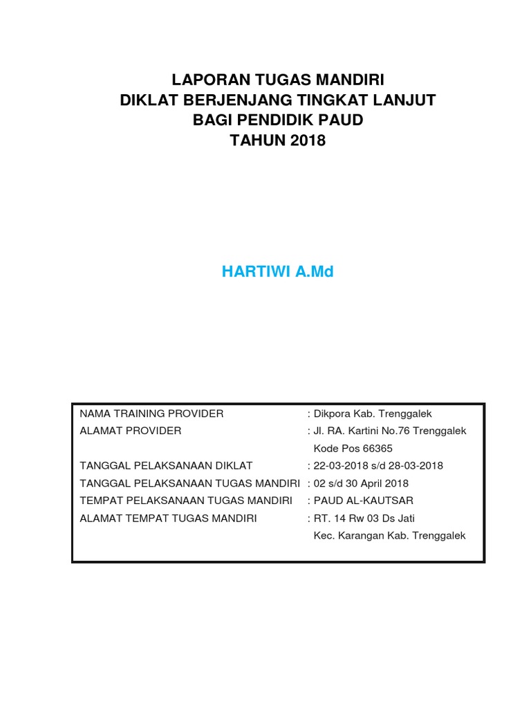 Laporan tugas mandiri diklat berjenjang tingkat lanjut bagi pendidik paud tahun hormaida tampubolon pdf free download. Kelompok bermain mandiri tugas mandiri alamat tempat. Inilah pembahasan lengkap terkait laporan tugas mandiri diklat berjenjang tingkat lanjut bagi pendidik paud. 12 desember s.d 16 desember 2016 tugas mandiri tempat pelaksanaan : Sri wahyuti,s.pd unit kerja :